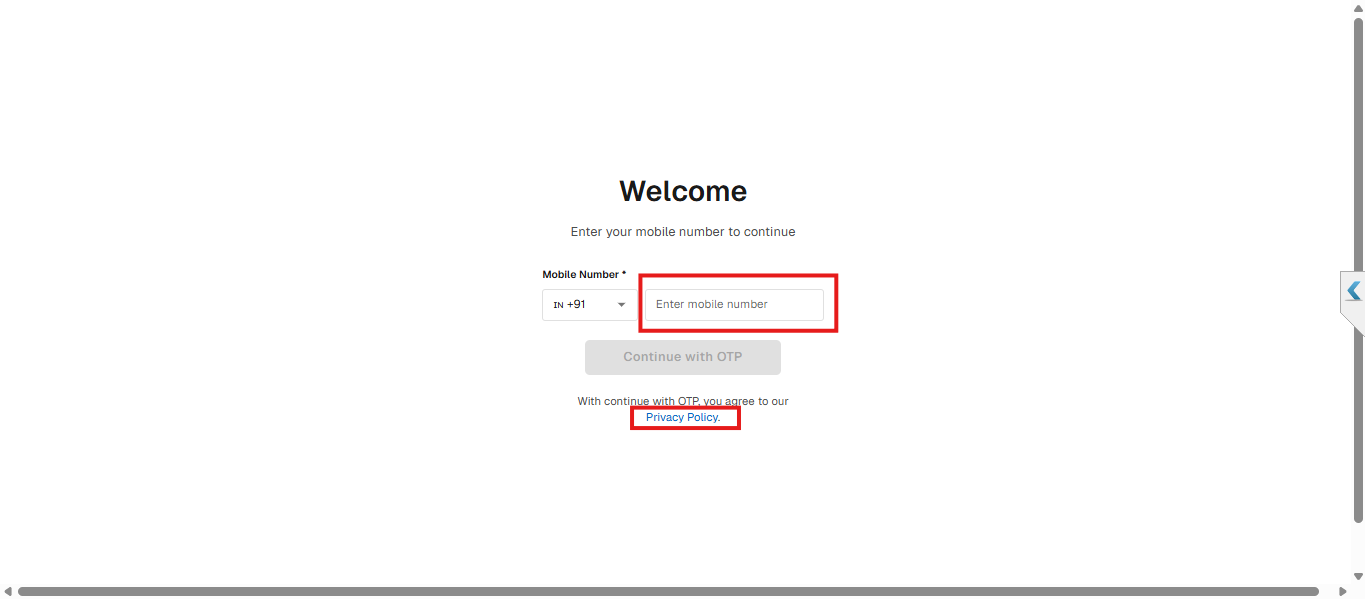 Enter your Indian mobile number in the input box and click Continue with OTP.
